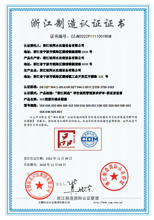 ?浙江鉆邦水處理設備有限公司生產(chǎn)的SDE型紫外線(xiàn)殺菌器是對照浙江制造團體標準《家用和類(lèi)似用途飲用水處理裝置用紫外線(xiàn)殺菌器》T/ZZB 2720-2022,通過(guò)第三方(權威機構)型式試驗驗證,產(chǎn)品先進(jìn)性指標達到團體標準要求,體現了 “浙江制造”標準的“國內一流,國際先進(jìn)”的理念。
