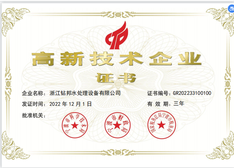 日前,浙江鉆邦水處理設備有限公司通過(guò)寧波市科學(xué)技術(shù)局、寧波市財政局、國家稅務(wù)總局寧波市稅務(wù)局等多部委聯(lián)合評定,從眾多企業(yè)脫穎而出,榮獲“國家高新技術(shù)企業(yè)”認證稱(chēng)號。