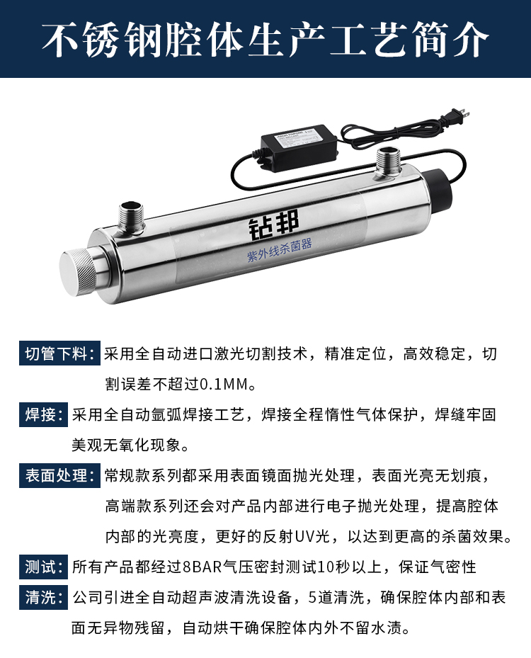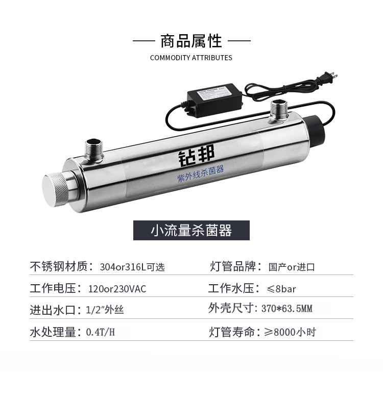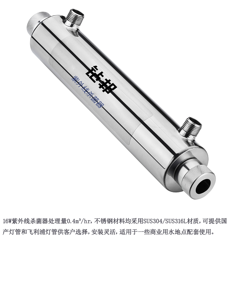 16W紫外線(xiàn)殺菌器處理量0.4m3/hr,不銹鋼材料均采用SUS304/SUS316L材質(zhì),可提供國產(chǎn)燈管和飛利浦燈管供客戶(hù)選擇,安裝靈活,適用于一些商業(yè)用水地點(diǎn)配套使用。