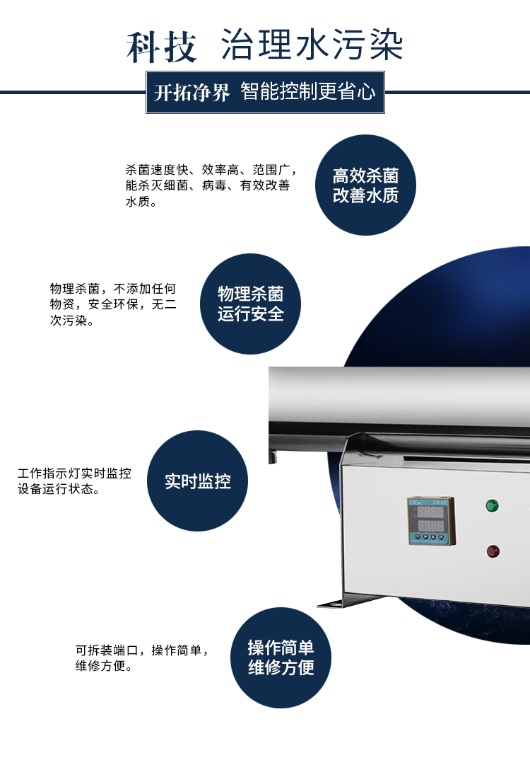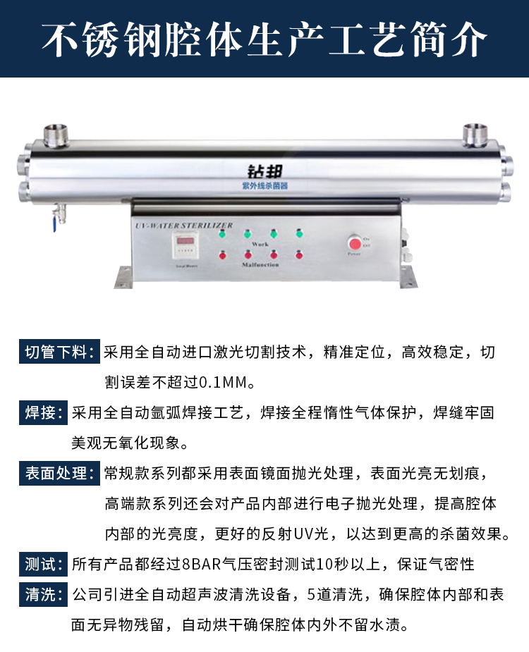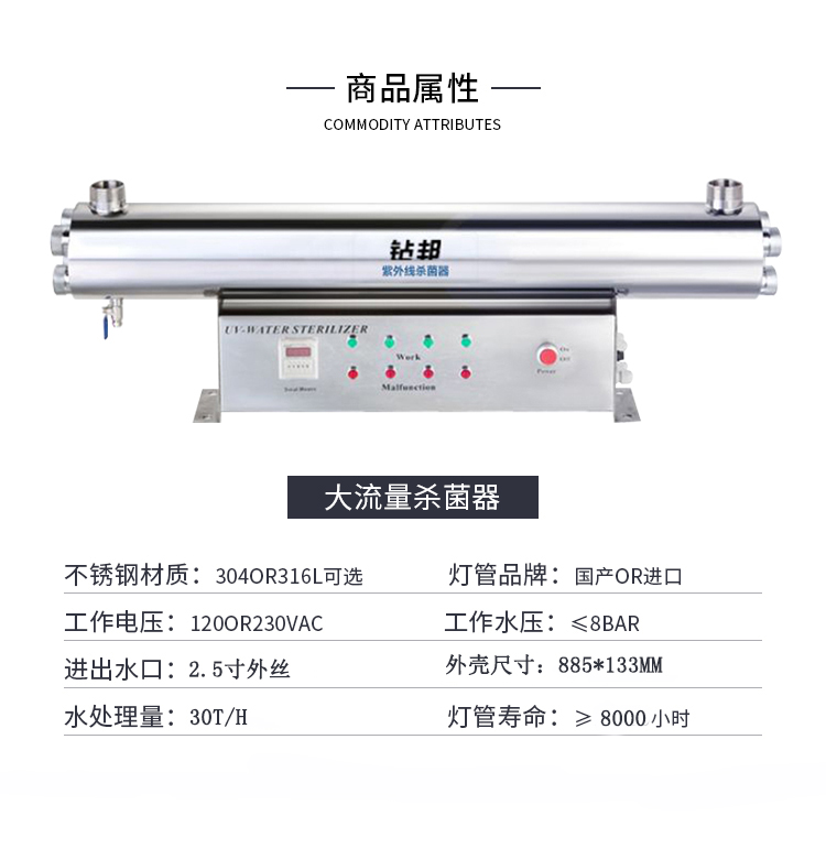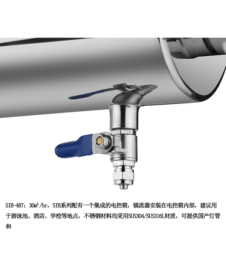 30m3/hr,SIB系列配有一個(gè)集成的電控箱,鎮流器安裝在電控箱內部,建議用于游泳池、酒店、學(xué)校等地點(diǎn),不銹鋼材料均采用SUS304/SUS316L材質(zhì),可提供國產(chǎn)燈管和萊邵思燈管供客戶(hù)選擇。