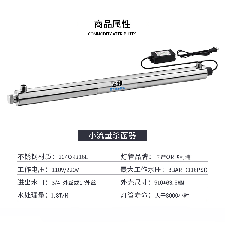 30W紫外線(xiàn)殺菌器,處理量1.8m3/hr,不銹鋼材料均采用SUS304/SUS316L材質(zhì),可提供國產(chǎn)燈管和飛利浦燈管供客戶(hù)選擇,適用于學(xué)校、商場(chǎng)等一些公共用水環(huán)境。