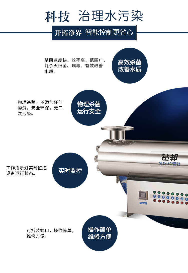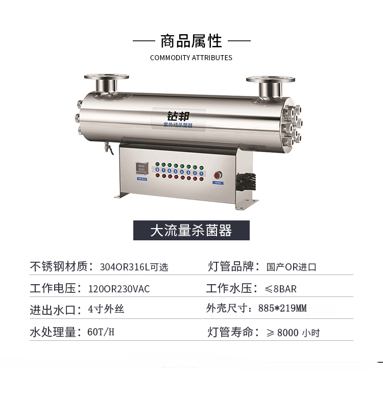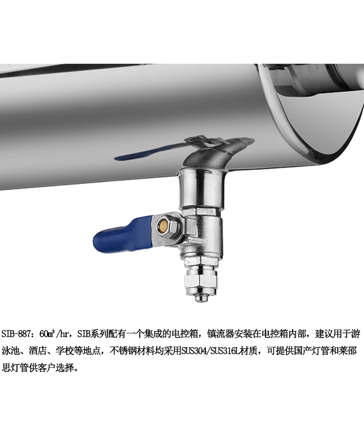 60m3/hr,SIB系列配有一個(gè)集成的電控箱,鎮流器安裝在電控箱內部,建議用于游泳池、酒店、學(xué)校等地點(diǎn),不銹鋼材料均采用SUS304/SUS316L材質(zhì),可提供國產(chǎn)燈管和萊邵思燈管供客戶(hù)選擇。