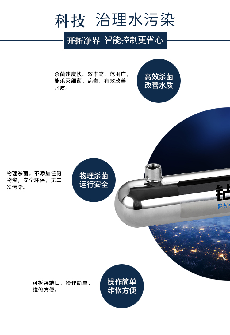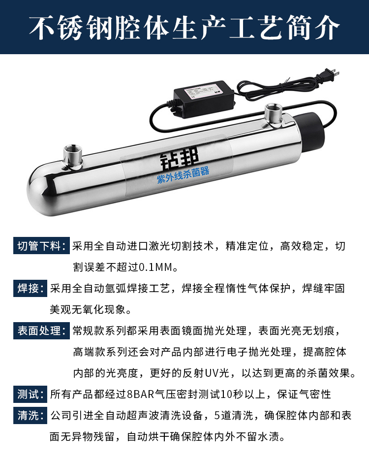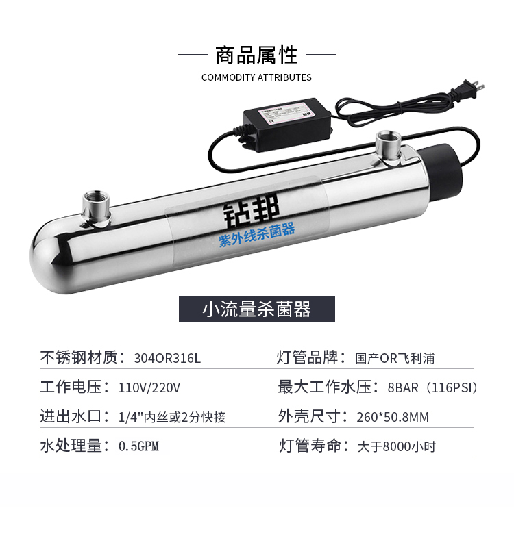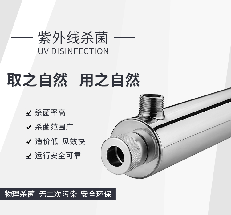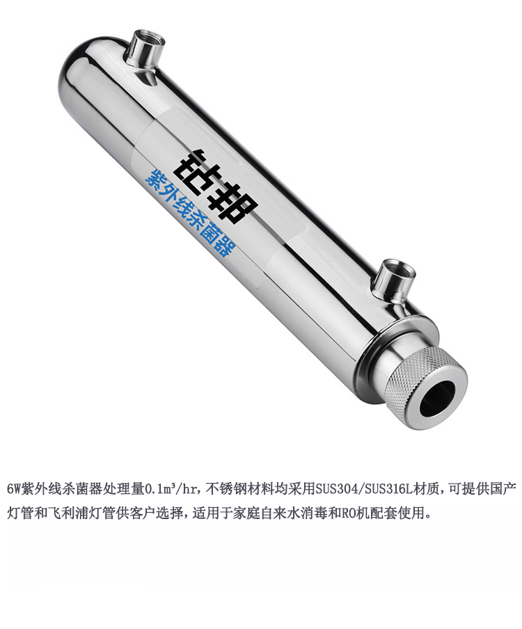 6W紫外線(xiàn)殺菌器處理量2L/min,不銹鋼材料均采用SUS304/SUS316L材質(zhì),可提供國產(chǎn)燈管和飛利浦燈管供客戶(hù)選擇,適用于家庭自來(lái)水消毒和RO機配套使用。
